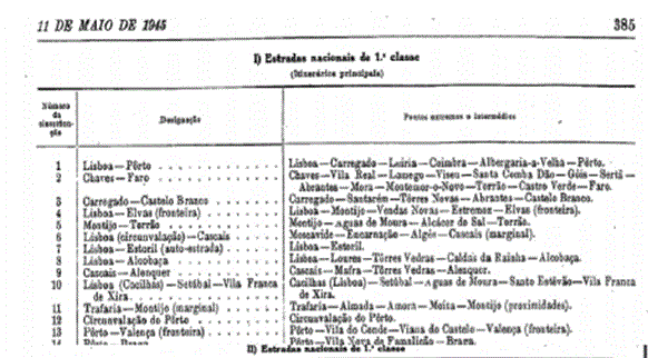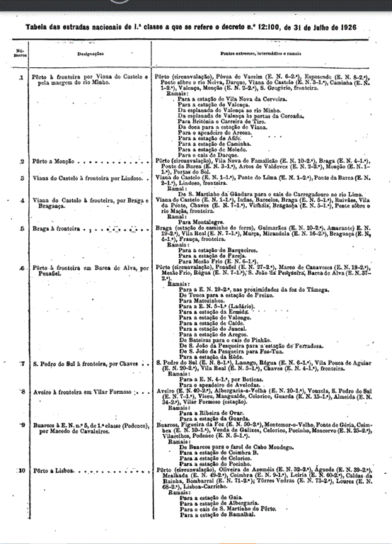 Em 1926 é publicado o decreto 12.100 de 31 de julho em que é aprovado o plano geral das estradas nacionais de 1ª e 2ª classe do continente da república, organizado de harmonia com a Lei de 22 de fevereiro de 1913 em que classifica as estradas em classes e se referem várias ligações entre várias localidades. Entre elas surge a ligação Porto Lisboa e as localidades por onde passava, bem como identificava a numeração das estradas utilizadas.